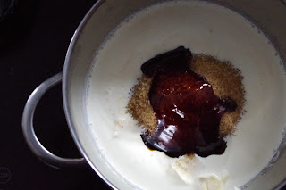 Den braunen Zucker mit der Butter und der Sahne in einen kleinen Topf geben...